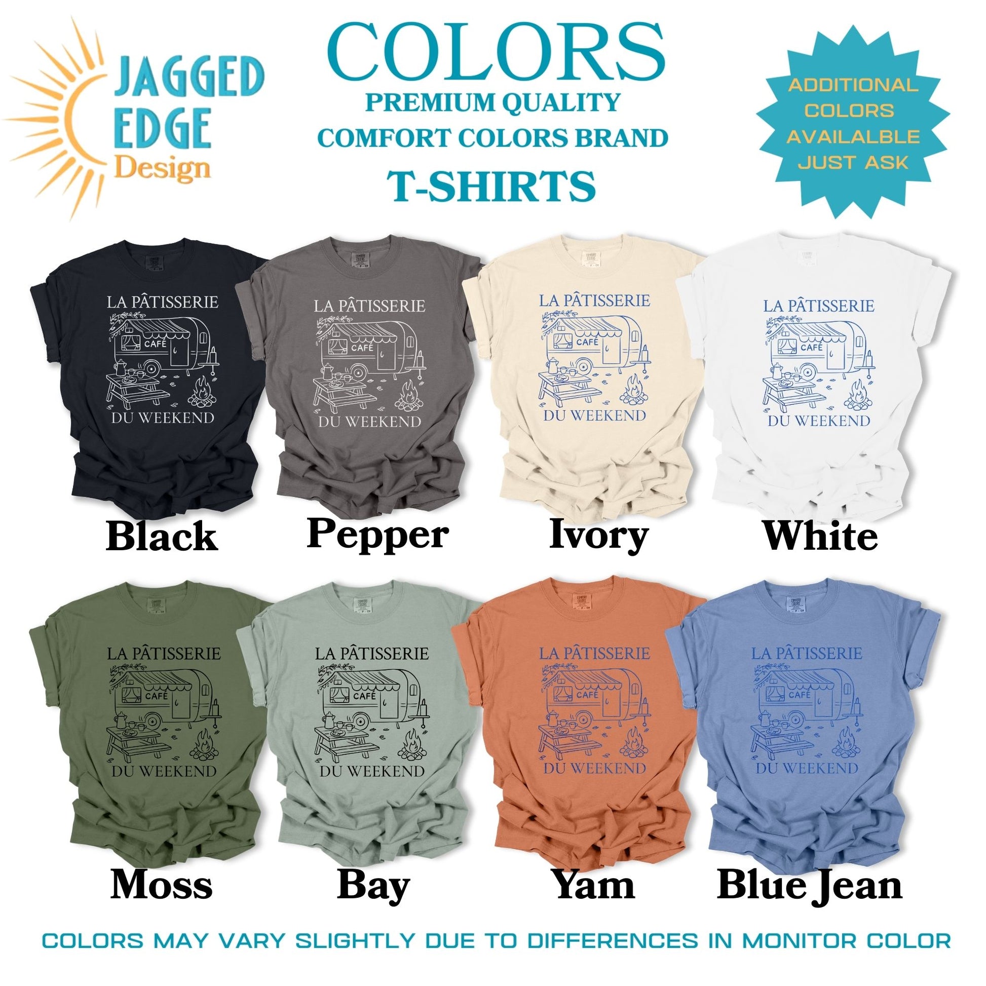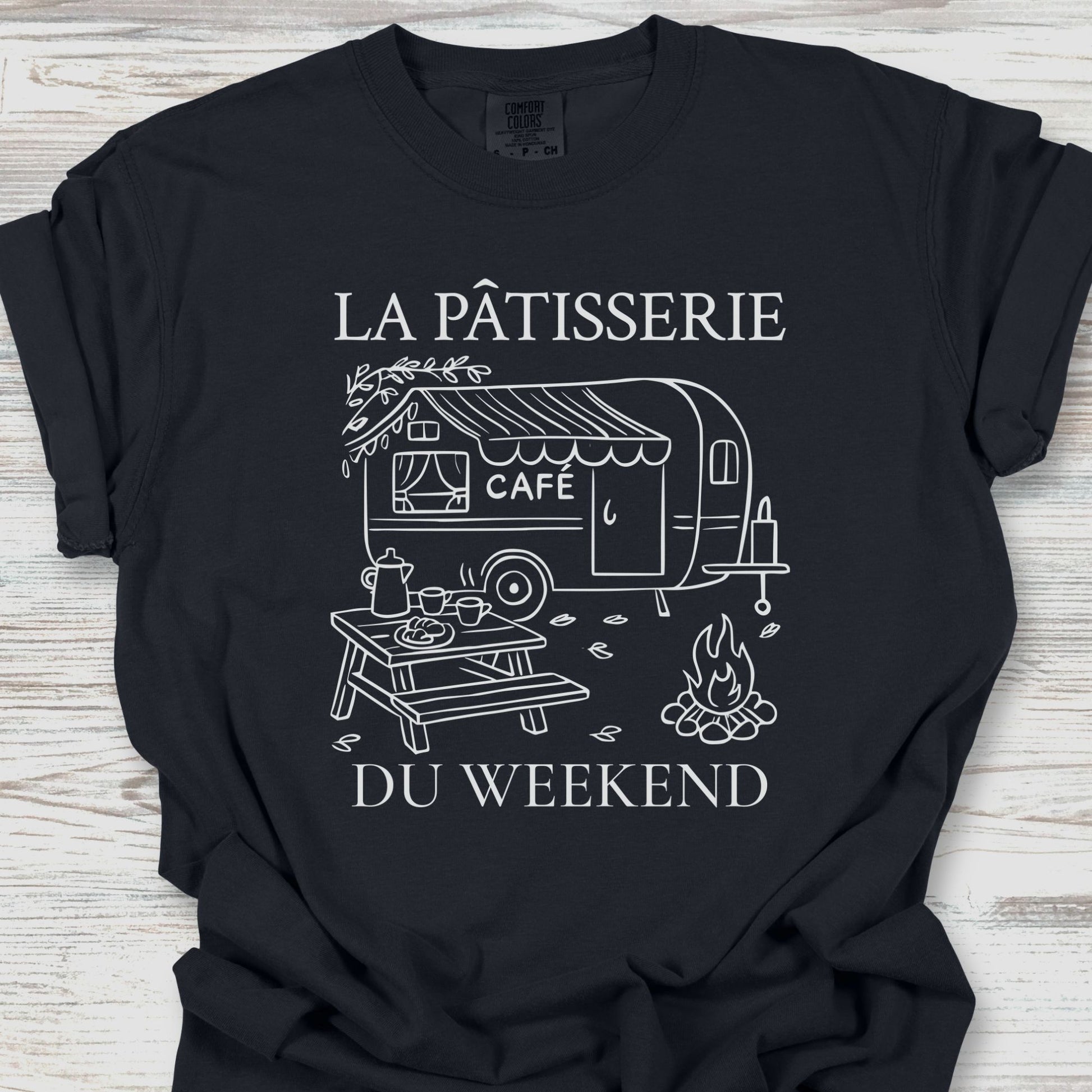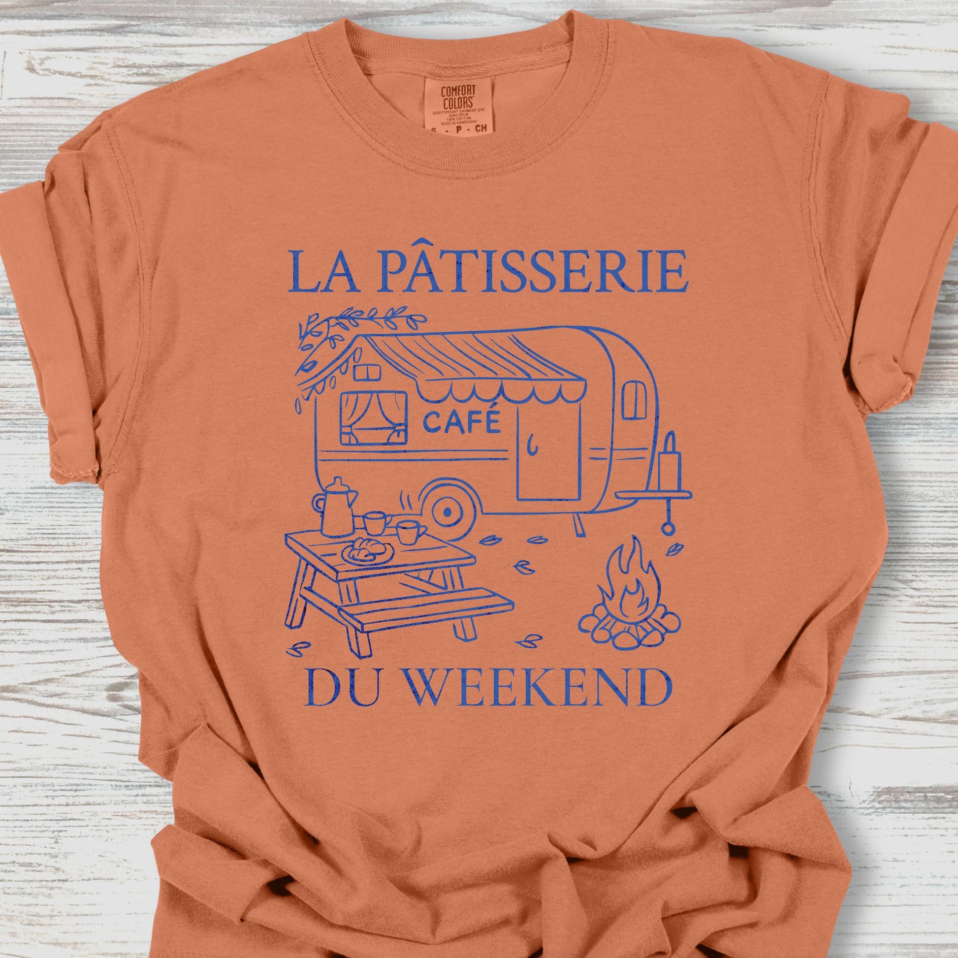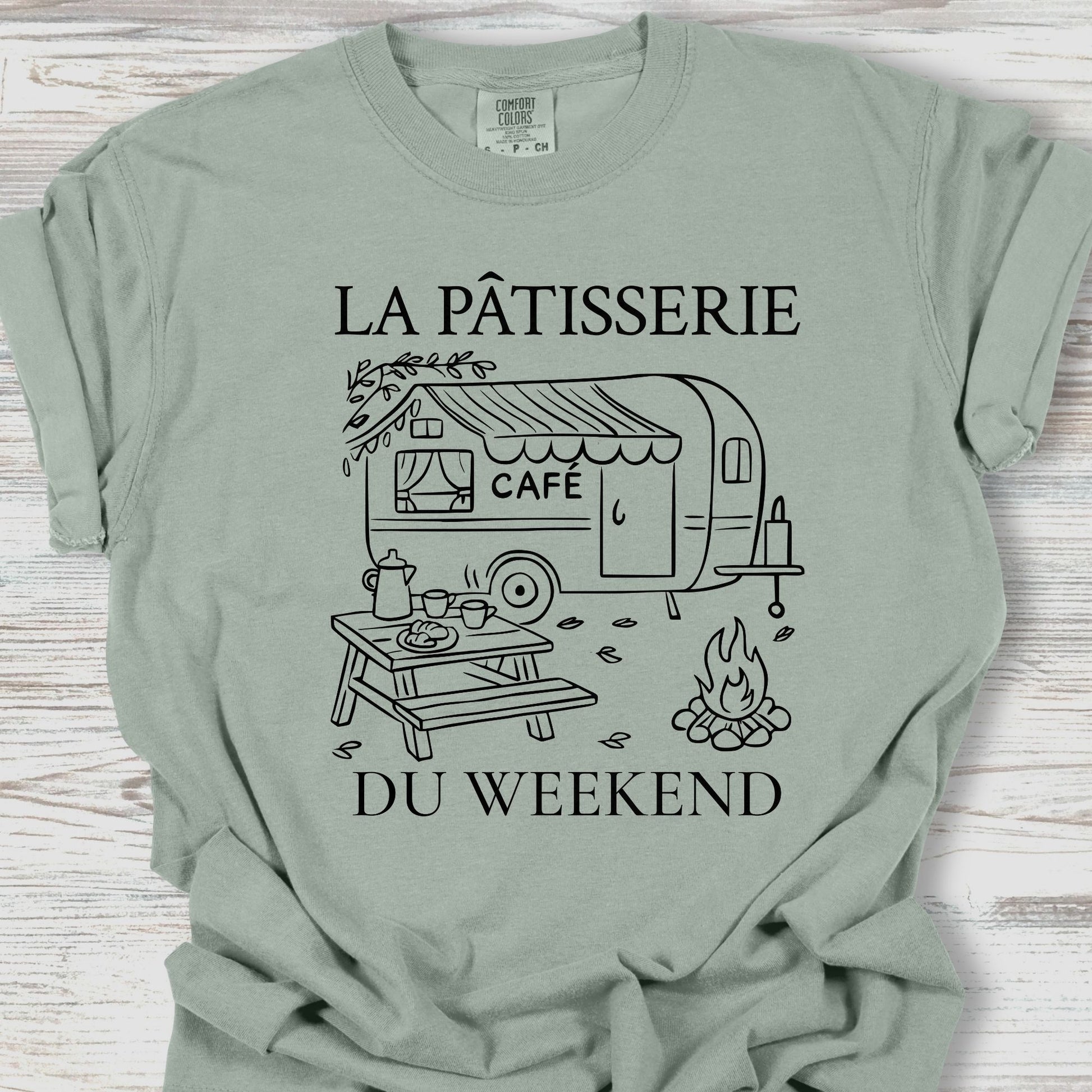 "LA PÂTISSERIE DU WEEKEND" features a charming French café camper scene with coffee, pastries, and a cozy campfire. Perfect for coffee lovers, camping enthusiasts, and fans of French-inspired retro aesthetics, this graphic design blends café culture with outdoor adventure in a unique way.