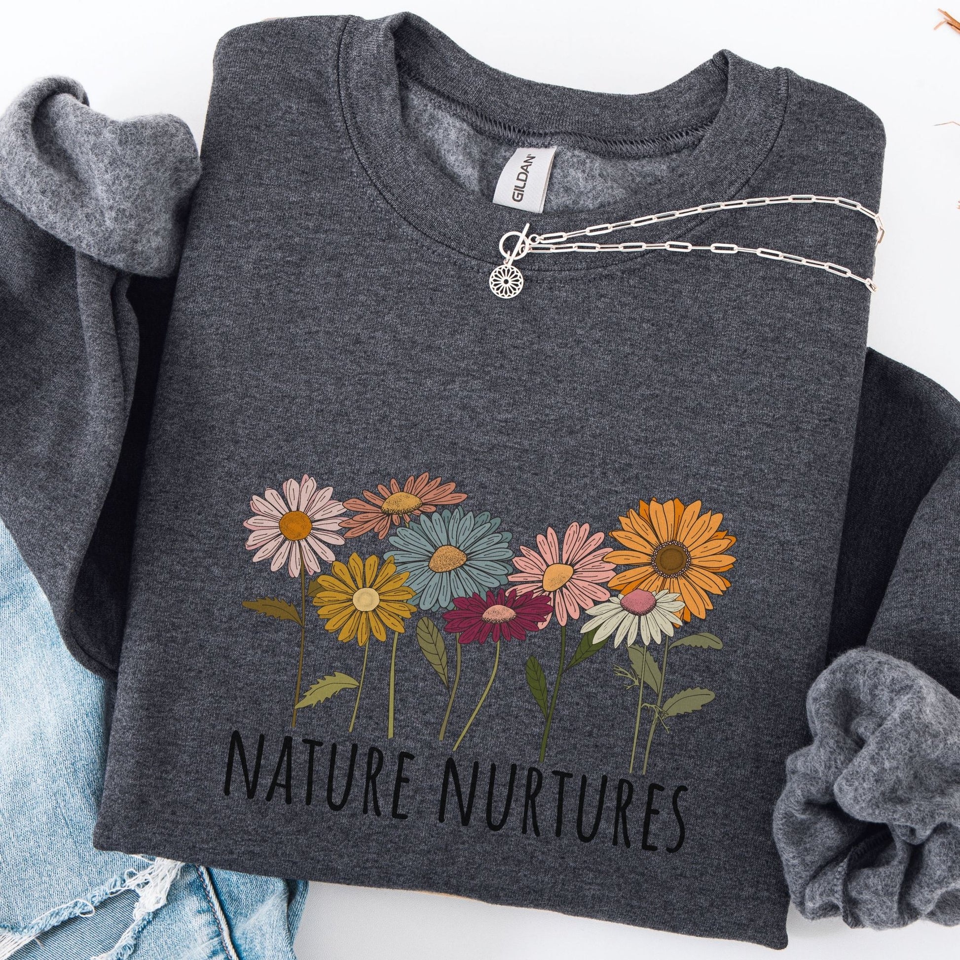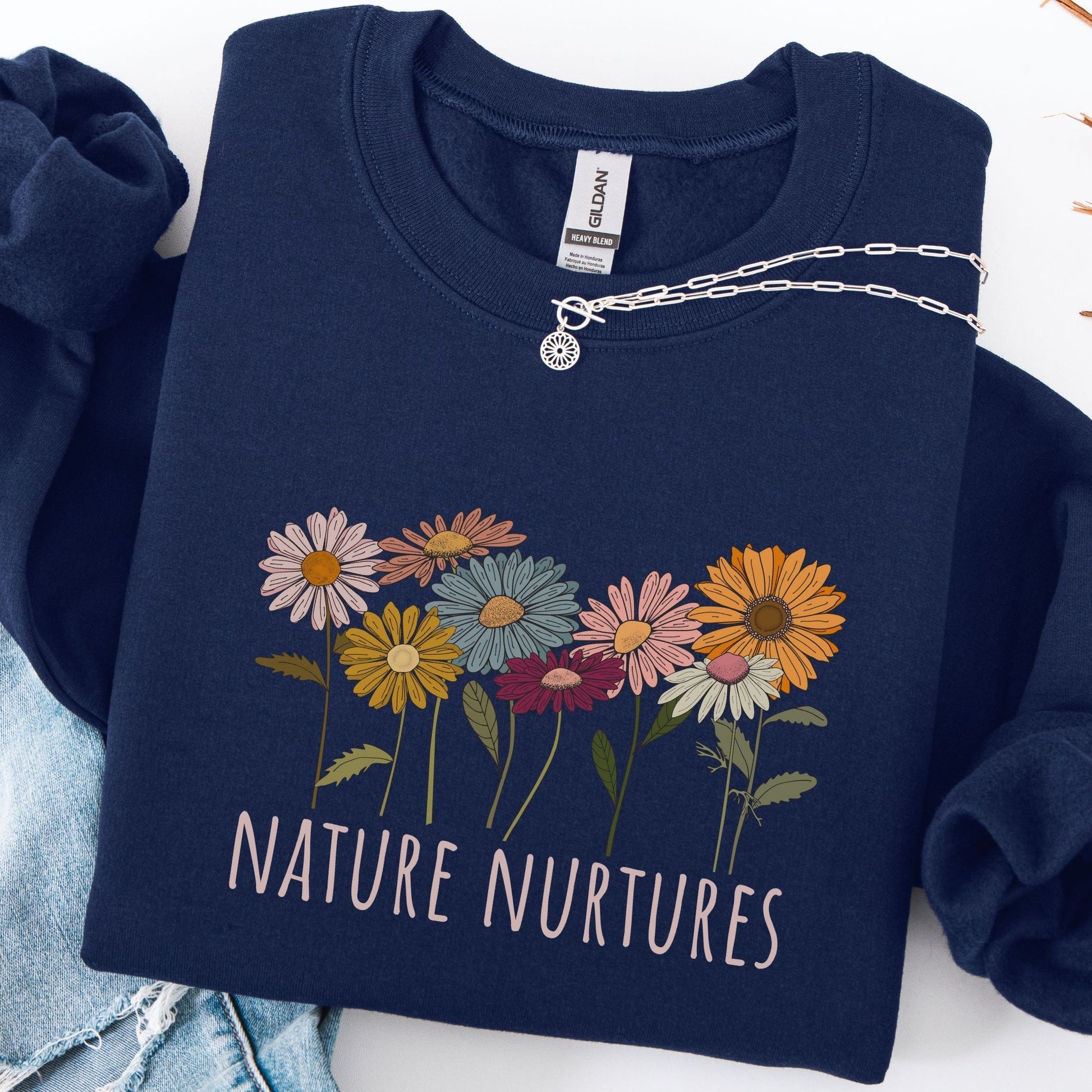 "Nature Nurtures" floral design features colorful wildflowers with a positive message, perfect for nature lovers, gardeners, and boho aesthetic fans. A cheerful retro botanical graphic with a sunny and uplifting vibe.