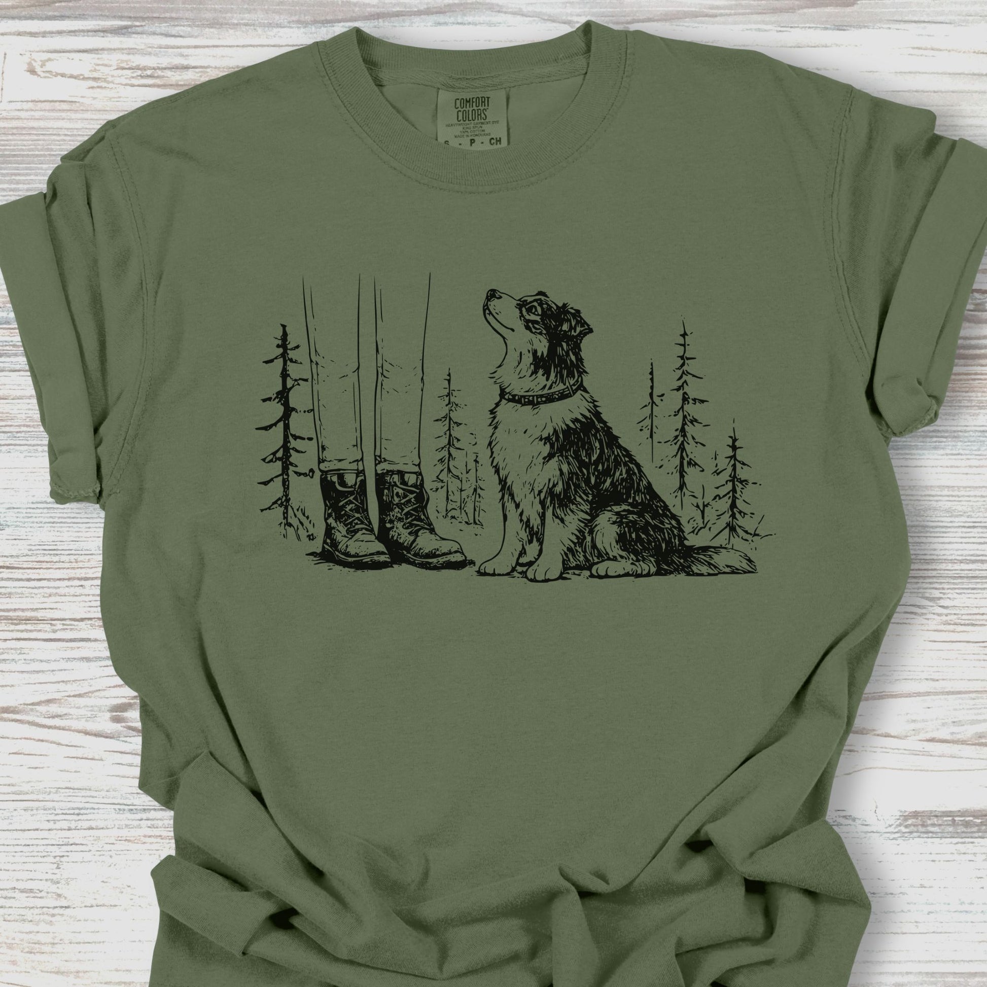 Detailed line art design featuring a loyal Australian Shepherd Dog sitting beside their human in a quiet forest trail scene. Expressive illustration captures companionship, outdoor adventure spirit, woodland calm, and a rustic lifestyle aesthetic.