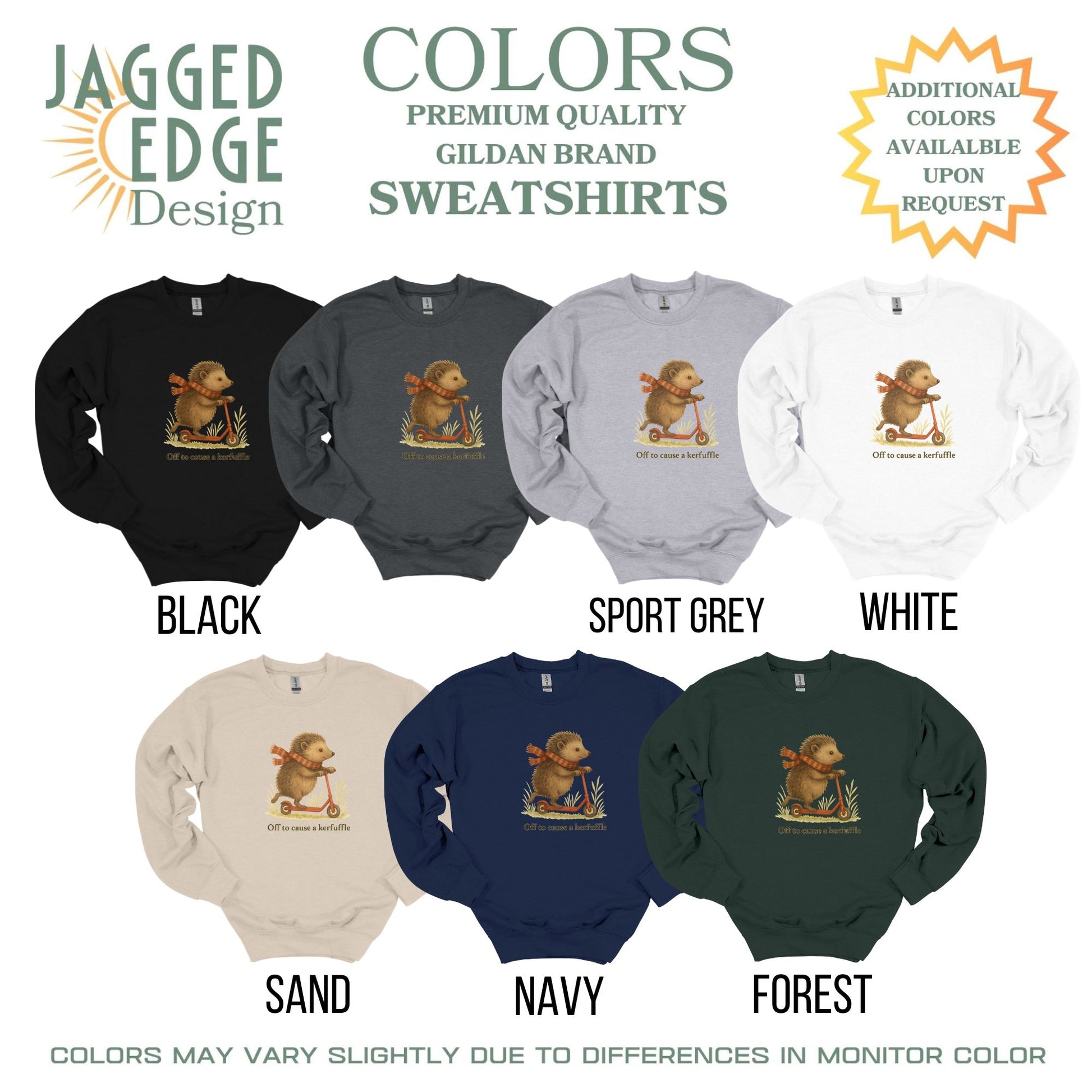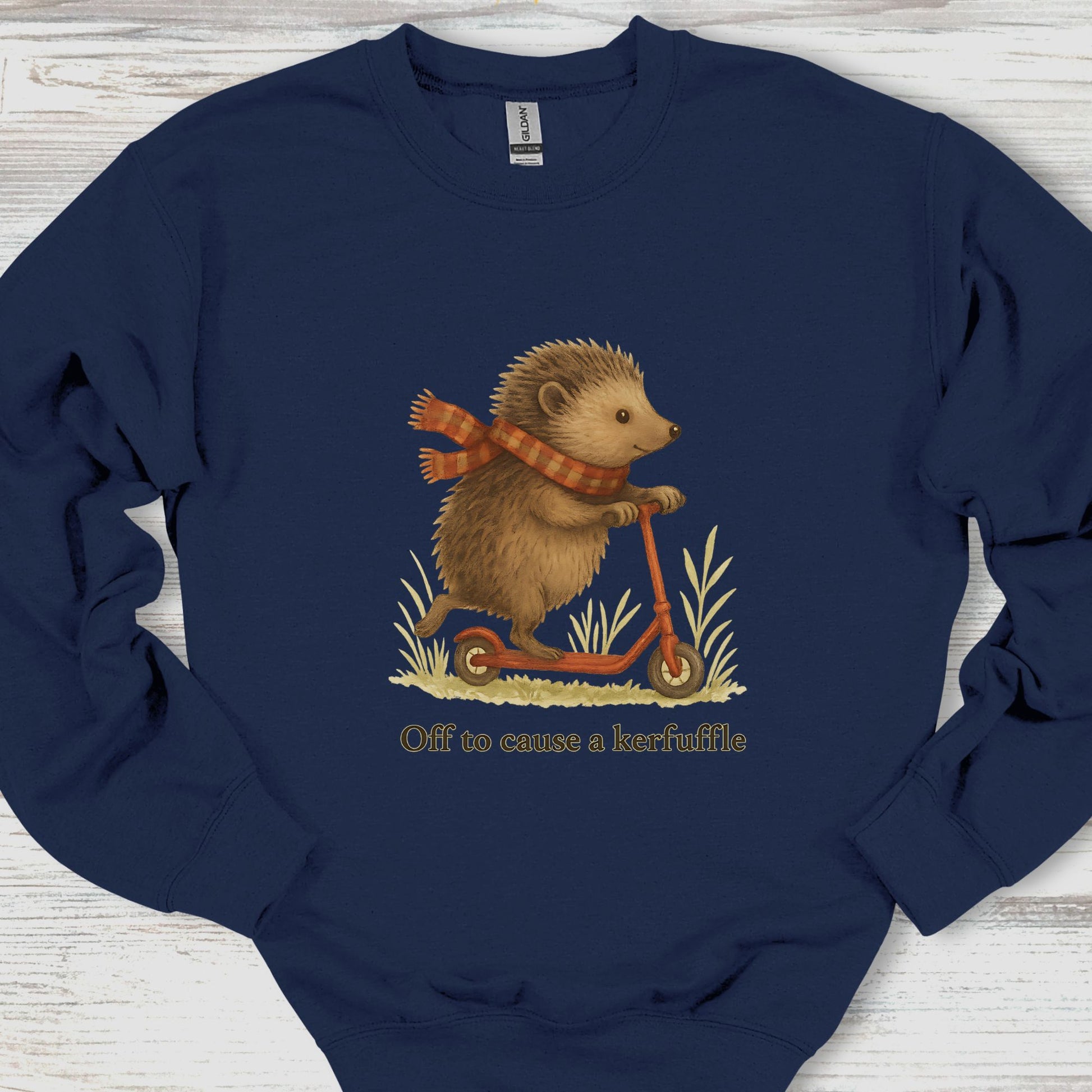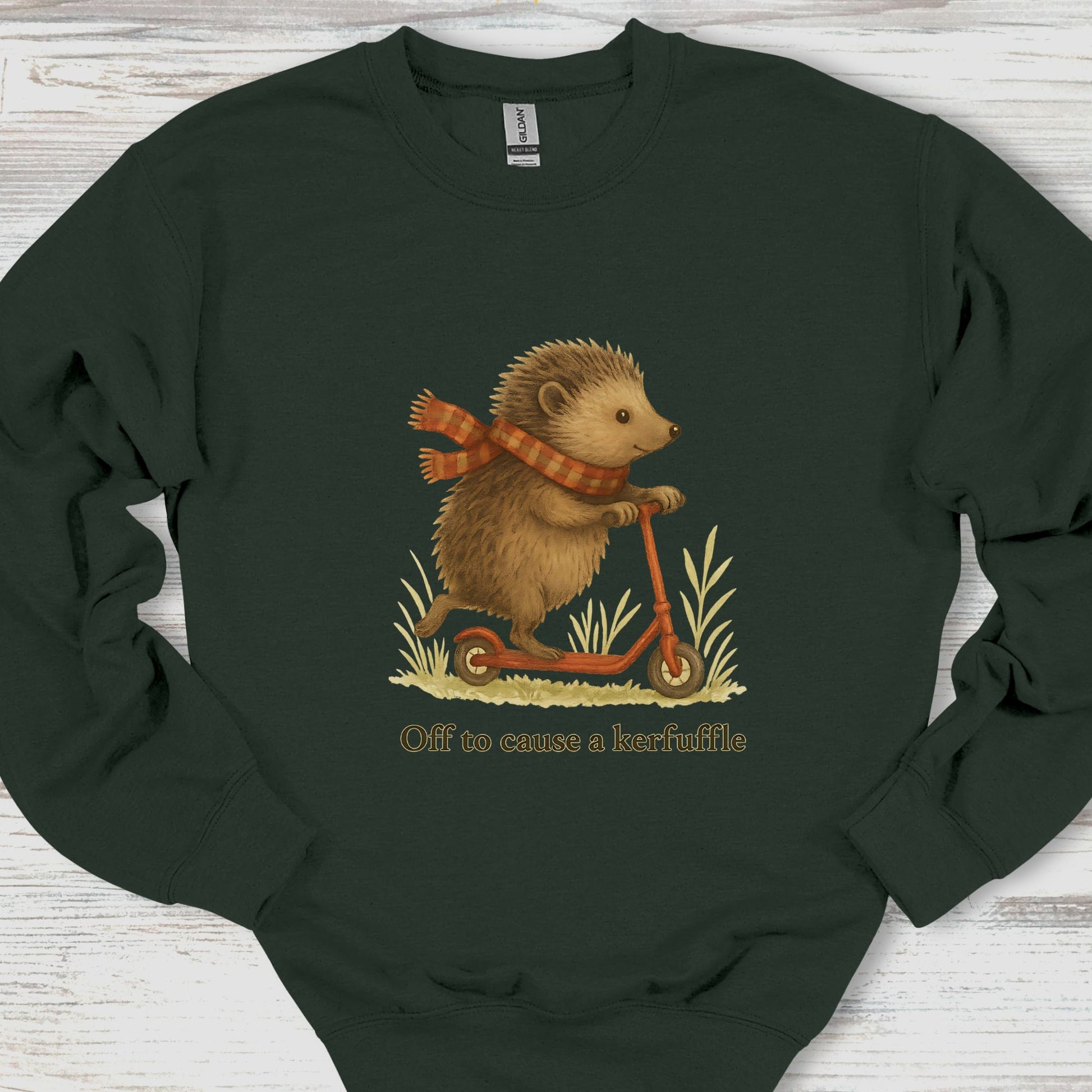 "Off to cause a kerfuffle" appears under a charming hedgehog wearing a striped scarf while riding a scooter. This cozy and whimsical design captures playful cottagecore vibes, blending retro aesthetic with a mischievous animal character. Perfect for lovers of cute woodland creatures and lighthearted graphic art.