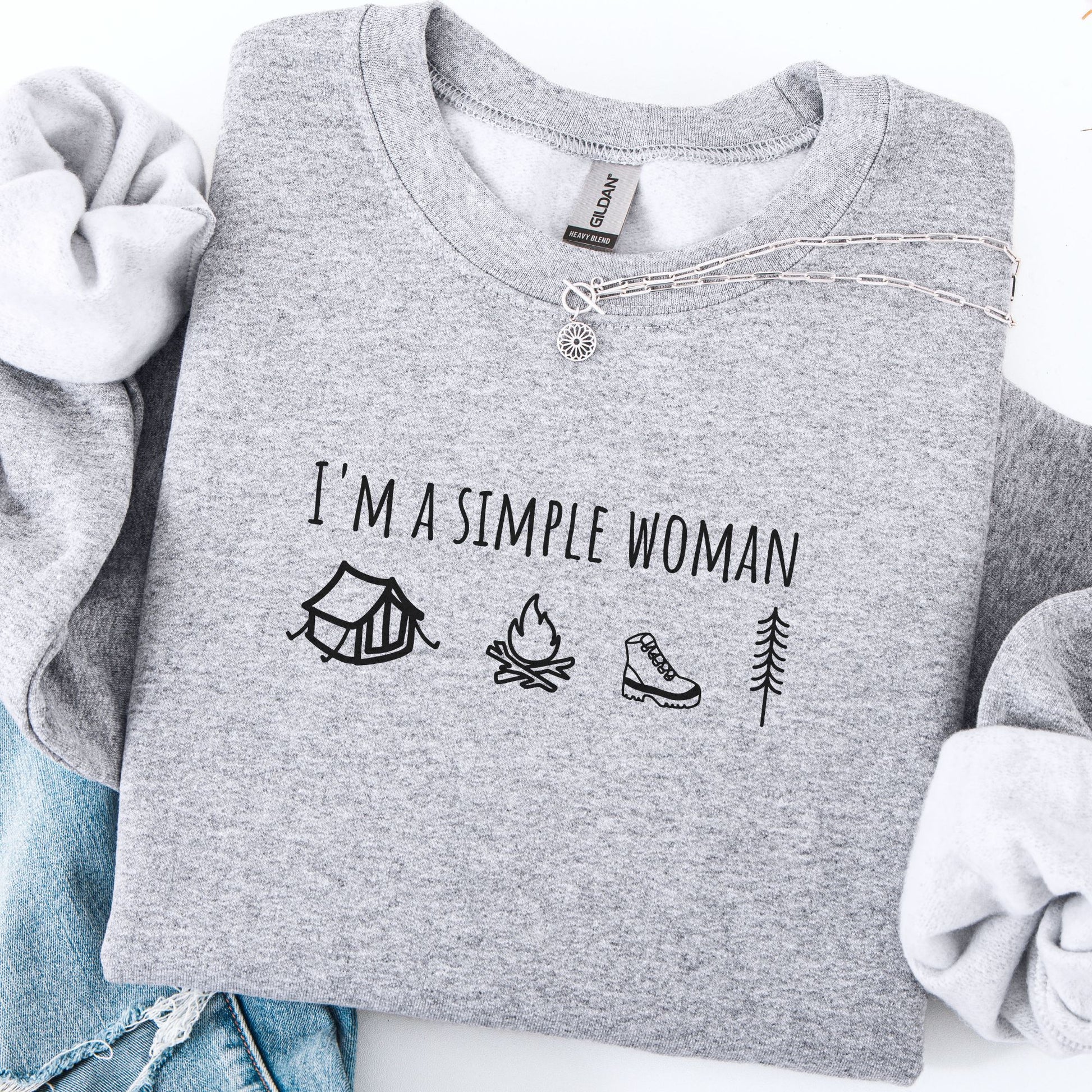 “I’m A Simple Woman” Tee featuring camping icons of a tent, campfire, hiking boot, and pine tree. A cozy graphic design for outdoor lovers, hikers, and adventure seekers. The perfect gift for nature enthusiasts who enjoy outside adventures.