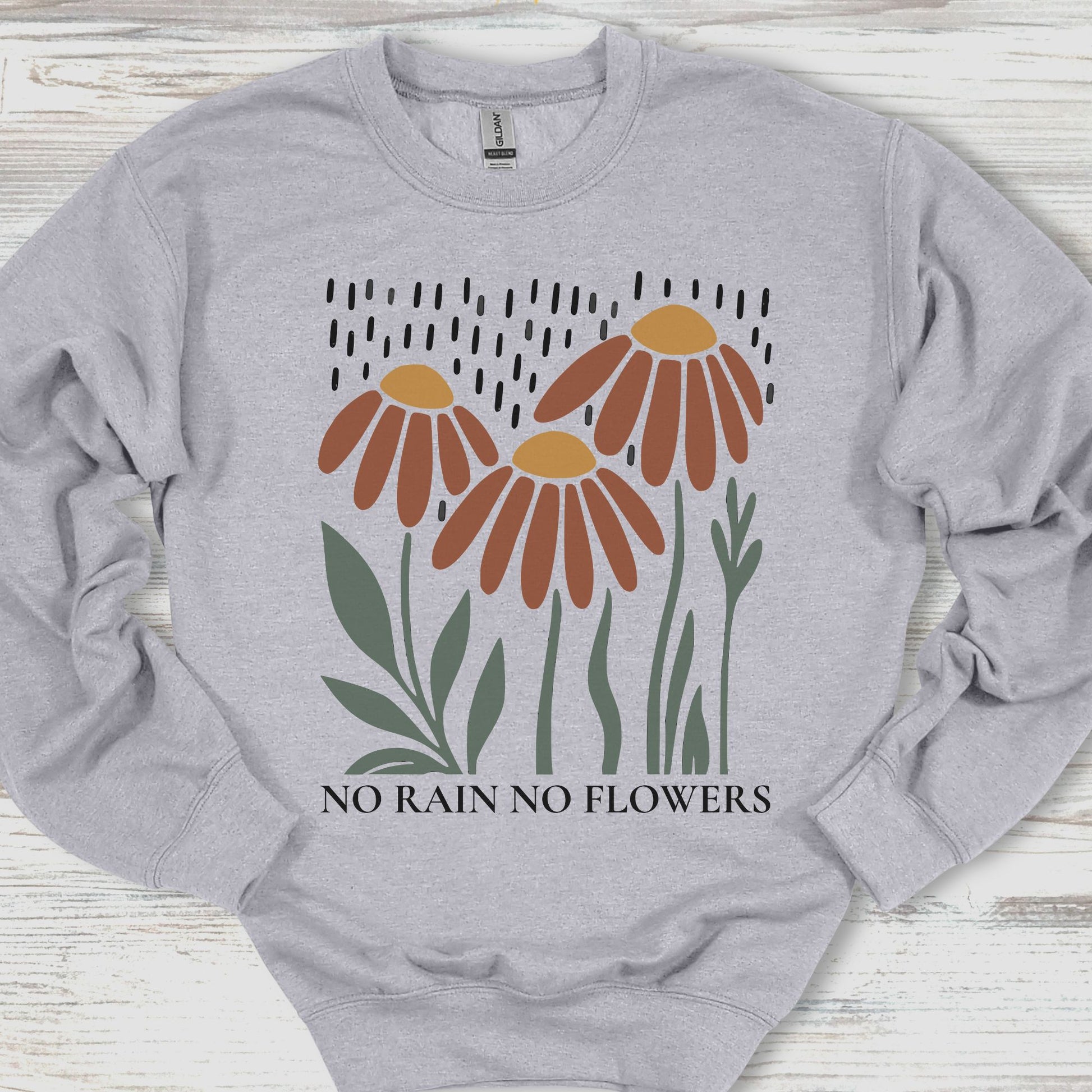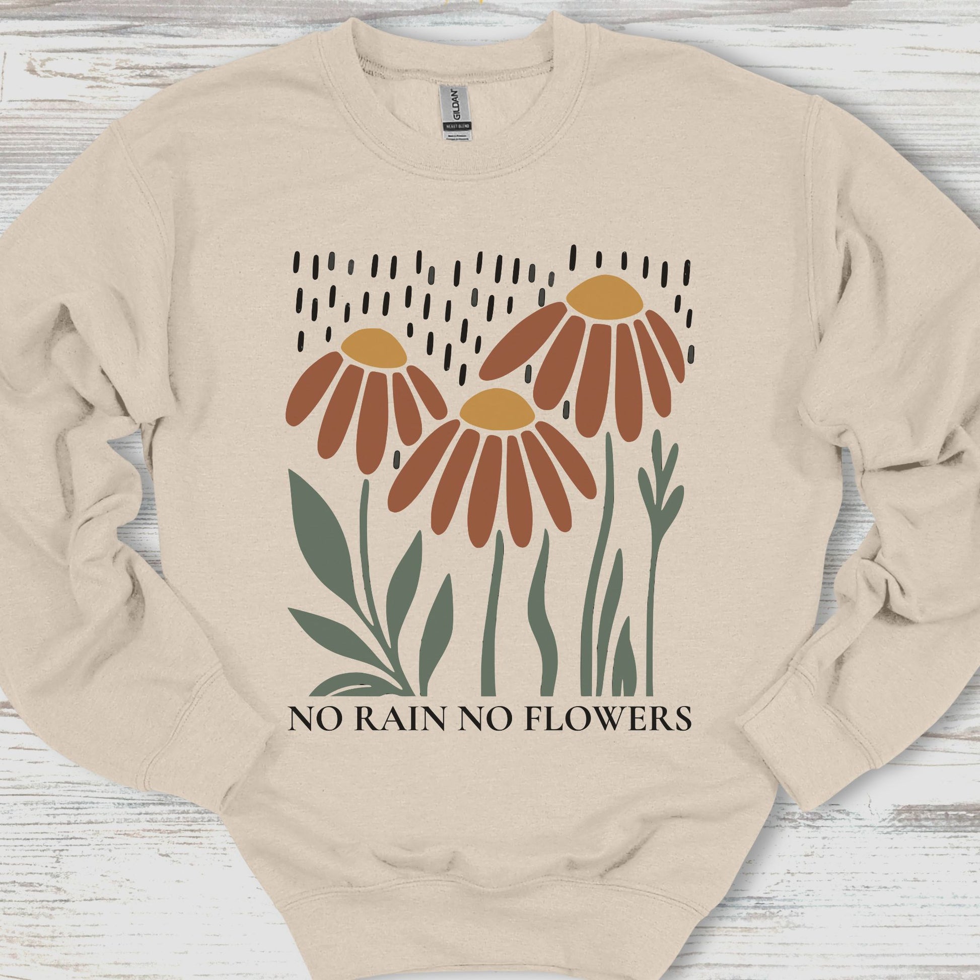 Features the uplifting quote “No Rain No Flowers” with a charming hand-drawn style red daisy illustration. A vintage-inspired floral design that celebrates growth, resilience, and positivity.