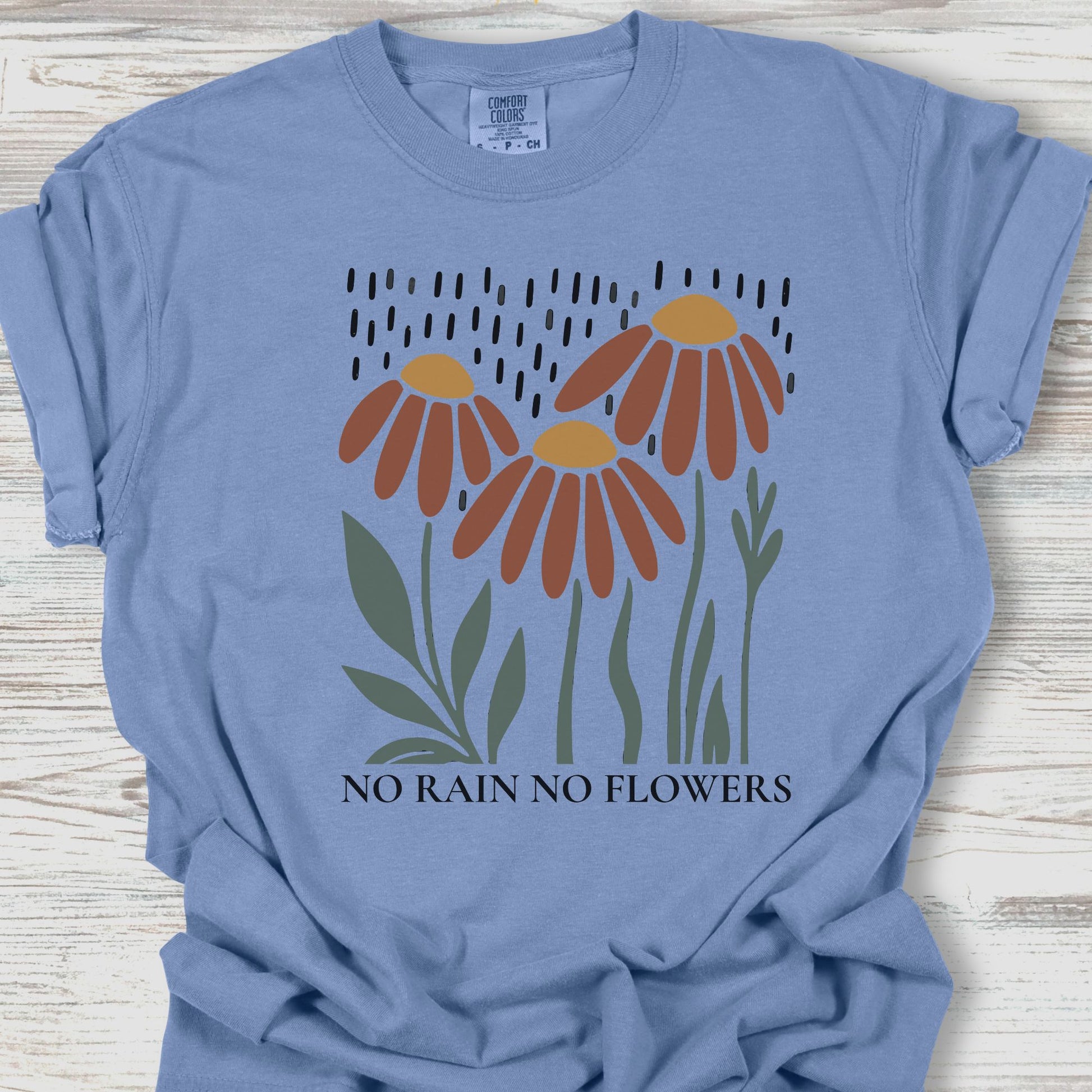 Features the uplifting quote “No Rain No Flowers” with a charming hand-drawn daisy illustration. A vintage-inspired floral design that celebrates growth, resilience, and positivity.