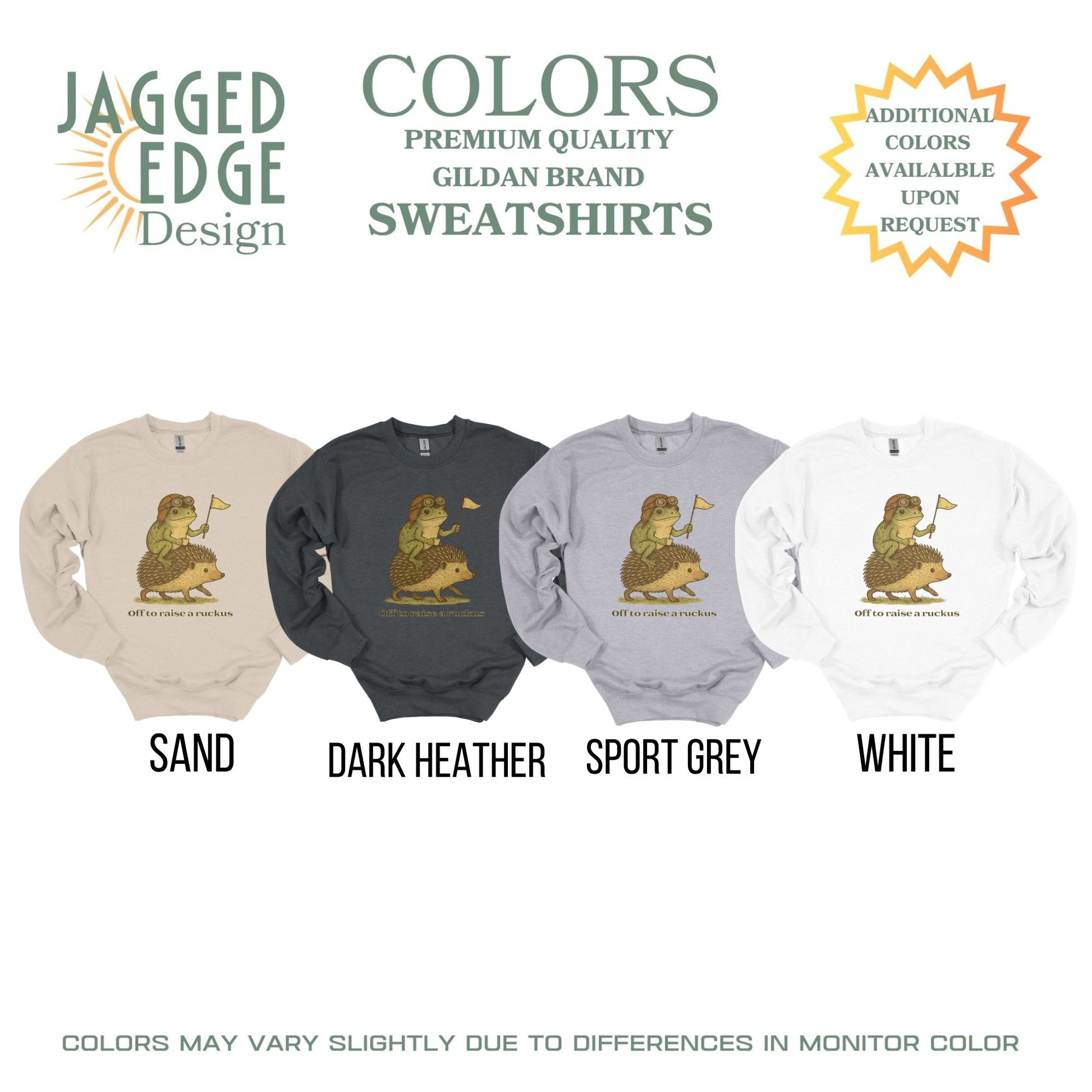 "Off to raise a ruckus" features a playful frog wearing aviator goggles, holding a flag while riding a cheerful hedgehog. A fun and whimsical design perfect for animal lovers, adventurers, and anyone who enjoys cottage core themed art with a vintage twist.