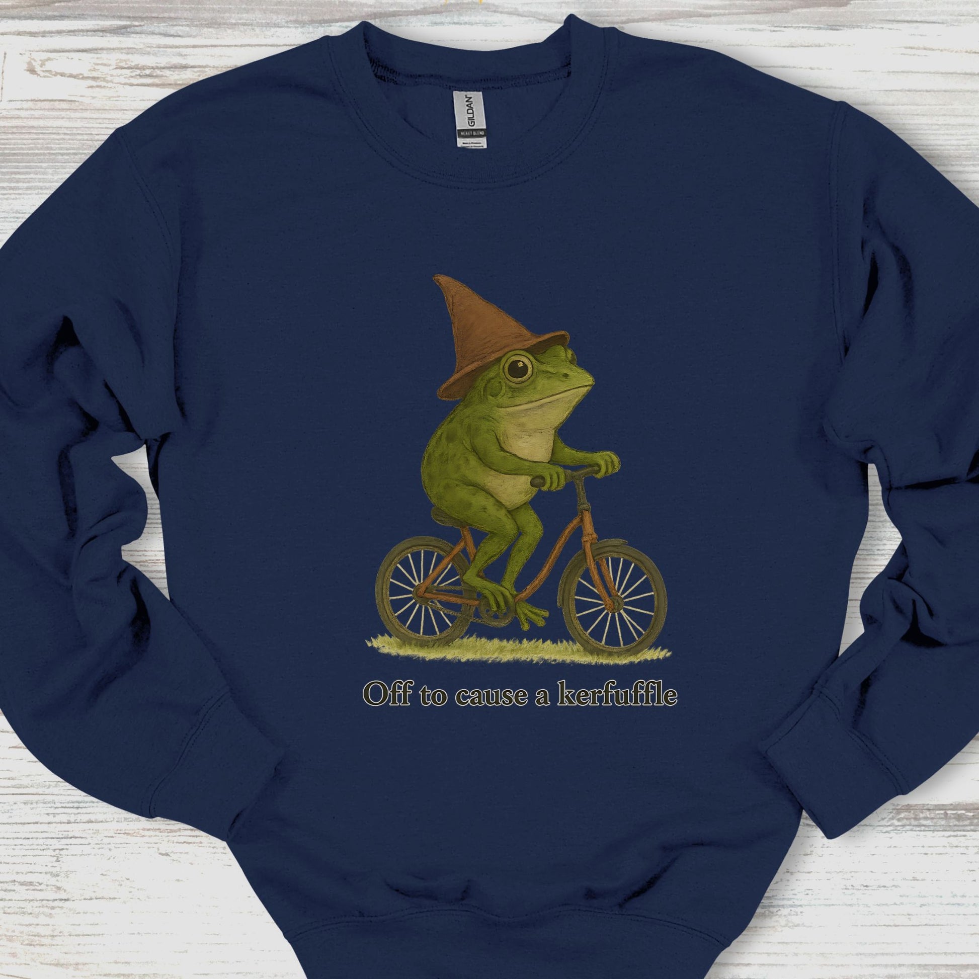 "Off to cause a kerfuffle" is printed below a whimsical frog wearing a pointed witch hat and riding a bicycle. This playful design blends cottagecore, magical, and humorous vibes, making it perfect for lovers of quirky animal graphics, witchy aesthetics, and retro-inspired artwork.